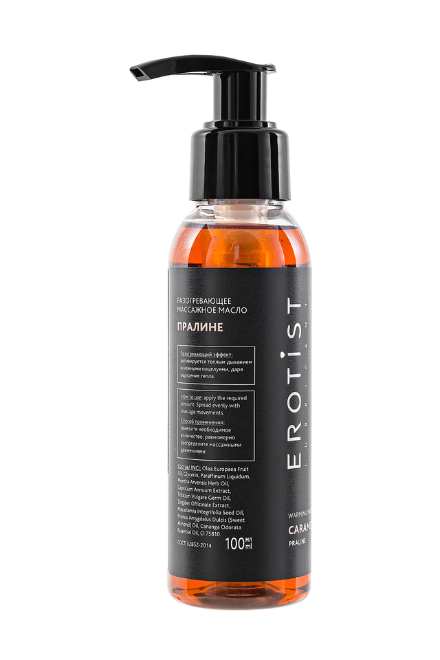 Масло «Пралине» из линейки Erotist Caramel Club создано для гурманов. Сладкий орехово-шоколадный аромат превращает массаж в соблазнительный ритуал, где тепло и нежность переплетаются с атмосферой удовольствия. Базу формулы составляют масла оливы, миндаля, макадамии и зародышей пшеницы, которые питают кожу, делая её мягкой и бархатистой. Экстракты имбиря и стручкового перца стимулируют кровообращение и обеспечивают разогревающий эффект. Эфирное масло иланг-иланга добавляет чувственности и гармонизирует эмоциональный фон. Особенности: Гурманский аромат пралине погружает в атмосферу сладости и удовольствия. Разогревающий эффект усиливает восприятие прикосновений. Масло обладает лёгкой текстурой, не оставляет липкости. Отличный выбор для романтического вечера. Способ применения: Нанесите масло на кожу, разотрите лёгкими или более глубокими движениями. Под действием тепла аромат раскрывается особенно ярко, делая массаж насыщенным и соблазнительным.