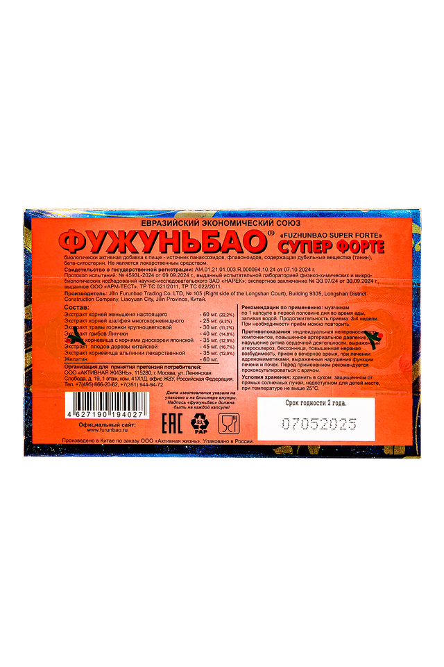 Биологически активная добавка «Фужуньбао Супер Форте» – это натуральный продукт, специально разработанный для мужчин, стремящихся улучшить эректильную функцию, повысить либидо и качество сексуальной жизни. Уникальный состав на основе экстрактов лекарственных растений способствует общему укреплению организма, стимулируя выработку тестостерона, улучшая кровообращение и повышая выносливость. Не является лекарством, но может служить эффективной поддержкой мужского здоровья при регулярном применении. «Фужуньбао Супер Форте» работает за счёт синергетического эффекта натуральных экстрактов. Женьшень и горянка стимулируют выработку тестостерона и повышают уровень циклического гуанозинмонофосфата, необходимого для расслабления гладких мышц и устойчивой эрекции. Линчжи и дереза действуют как адаптогены, повышая общую выносливость и снижая стресс. Альпиния и шалфей улучшают кровообращение, обеспечивая лучшее питание тканей. Диоскорея способствует гормональному балансу благодаря бета-ситостерину. В целом, добавка усиливает эндокринную систему, улучшает микроциркуляцию и повышает либидо без синтетических веществ. Состав: Экстракт корней женьшеня– 22,2 % , Экстракт корней шалфея – 9,3 %, Экстракт травы горянки крупноцветковой – 11,2%, Экстракт грибов Линчжи – 14,8%, Экстракт корневища с корнями диоскореи японской– 12,9%, Экстракт плодов дерезы китайской – 16,7%, Экстракт корневища альпинии лекарственной – 12,9%. Форма выпуска: Капсулы массой 330 мг. Показания к применению: Рекомендуется в качестве источника панаксозидов, флавоноидов, дубильных веществ (танин) и бета-ситостерина для мужчин, желающих поддержать эректильную функцию, повысить либидо и общую выносливость. Идеально для тех, кто сталкивается с возрастными изменениями или стрессом, влияющими на интимную жизнь. Способ применения: Мужчинам принимать по 1 капсуле в первой половине дня во время еды, запивая водой. Продолжительность курса: 3–4 недели. При необходимости курс можно повторить через перерыв. Противопоказания: • Индивидуальная непереносимость компонентов. • Повышенное артериальное давление. • Нарушение ритма сердечной деятельности. • Выраженный атеросклероз. • Бессонница или повышенная нервная возбудимость. • Приём в вечернее время (может вызвать бодрствование). • Лечение адреномиметиками. Выраженные нарушения функции печени и почек. Не рекомендуется превышать дозировку, чтобы избежать возможных нежелательных последствий. Перед применением обязательно проконсультируйтесь с врачом, особенно если у вас есть хронические заболевания. Условия хранения: хранить в сухом, защищённом от прямых солнечных лучей месте, недоступном для детей, при температуре не выше 25°C. Срок годности: 2 года.